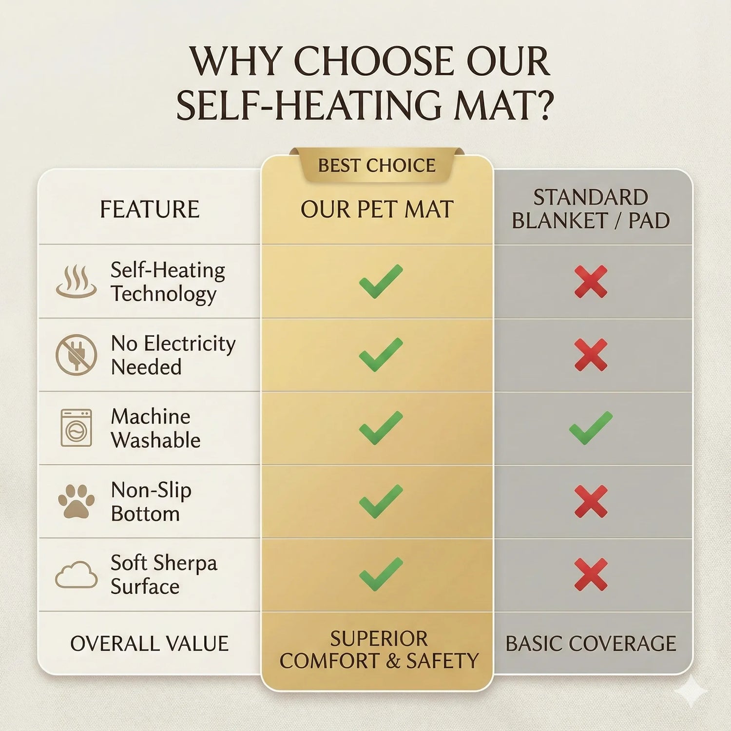 Safety. Electric pads are the #1 cause of pet bedding fires and can overheat sensitive skin. Our mat provides the same cozy warmth with zero risk. You gain the freedom to leave the house without worrying about your pet or your home.